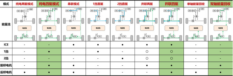 实现纯电驱动、能量回收、串联驱动、4 挡直驱、4 挡并联、驻车发电以及双模功率分流共计 7 种主要混动能量管理模式。