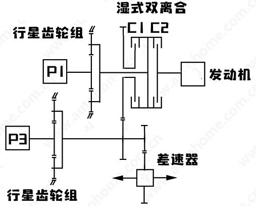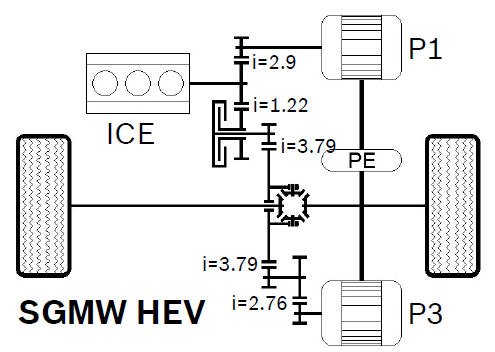 P1+P3+2AT, 双电机串并联混动系统,行星齿轮+离合器。