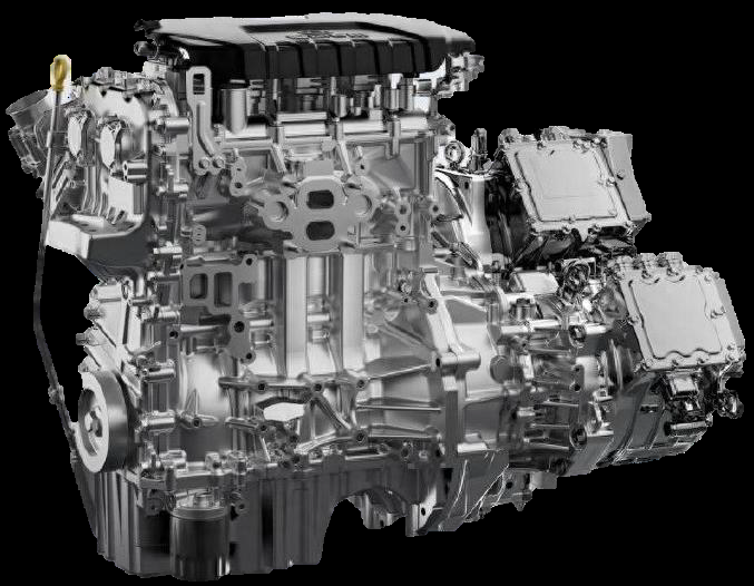- 第三部分为一个传统的两速的变速器。发动机及两个电机的扭矩在这里汇合,并传递至差速器。 EDU 变速器采用一个同步器选择第一或第二档,其传动比分别为1.912和1.021 (主减速比为 3.033),可以说是一般汽车内的第三和第五档。这意味着(由于发动机转速的限制)汽车在起步及慢速行驶时,发动机不能直接驱动汽车。此时,C1 离合器必须保持打开状态,C2 离合器关闭,汽车的驱动完全由 TM 电机负责,即电动行驶。